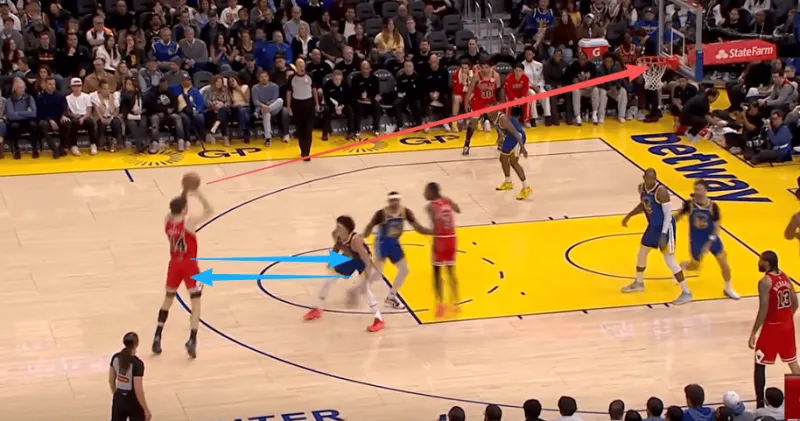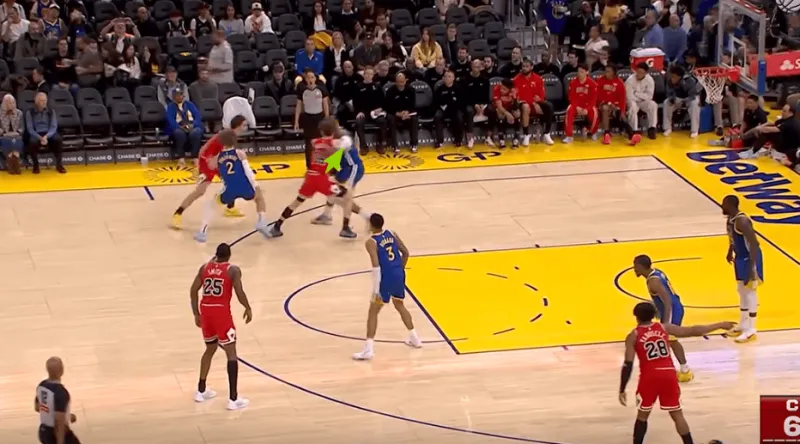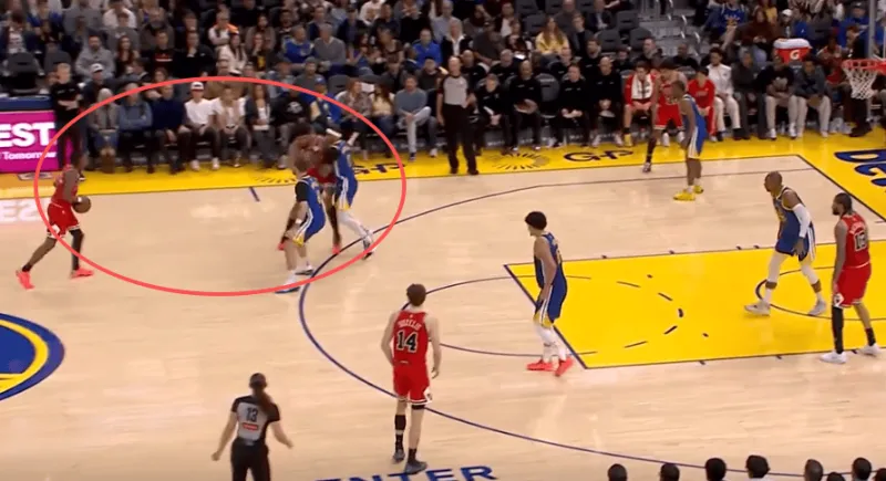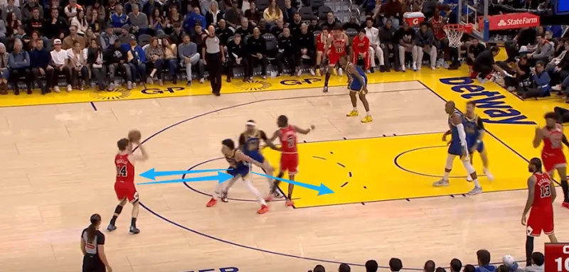 迪林汉姆左翼持球与亚布塞莱发动挡拆配合,被勇士换防破解后立即出球给弱侧接应的布泽利斯,