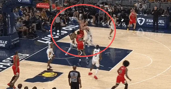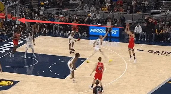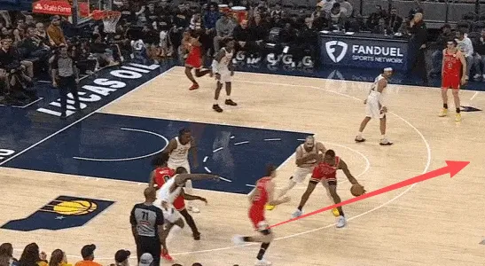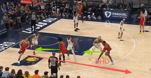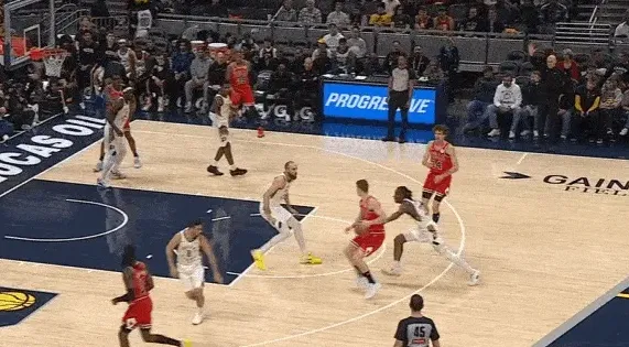 队友清空一侧,吉迪与布泽利斯在左翼发动边路二人转配合:布泽利斯先是为吉迪设置“Touch Screen”,随后佯装外弹兜至三分心外为突破的吉迪拉开空间,